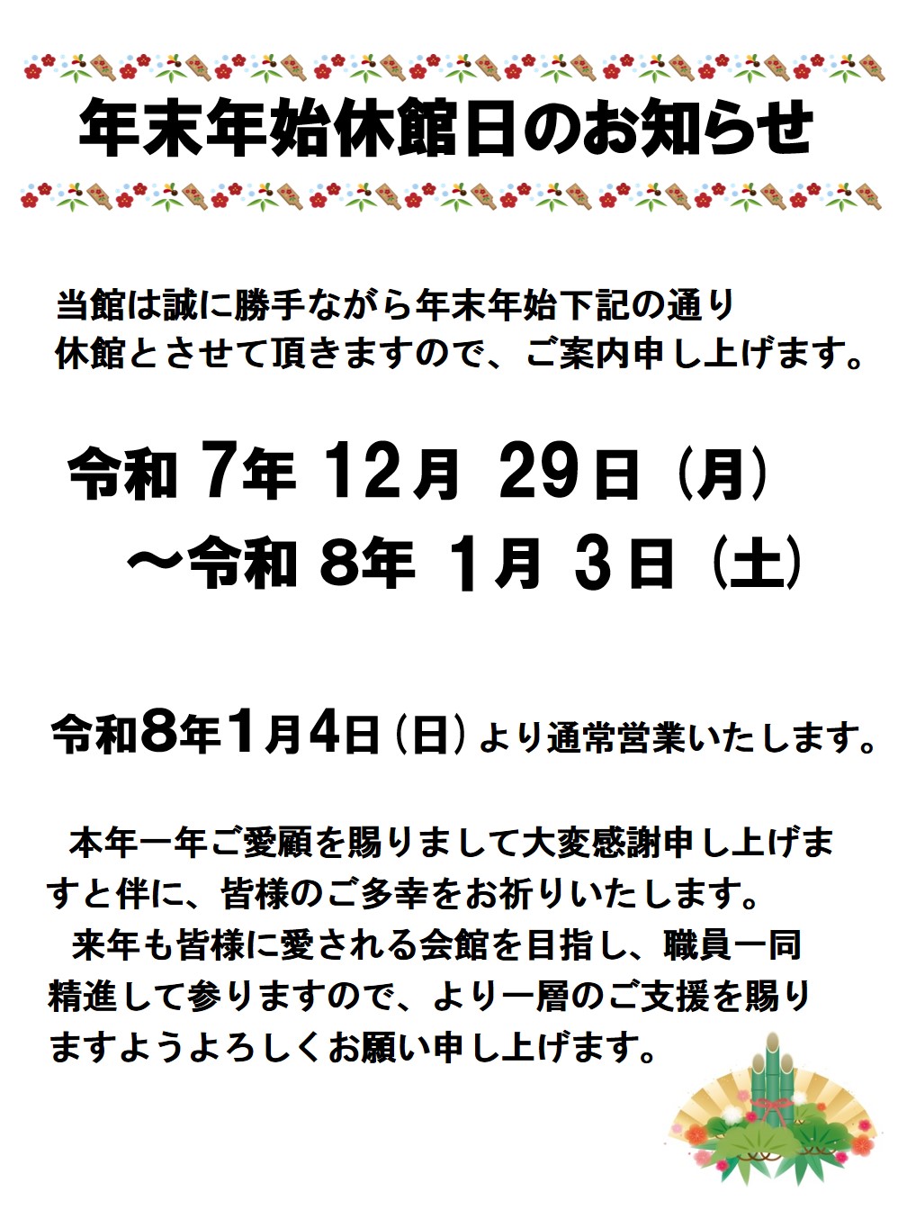 【年末年始休館日のお知らせ】